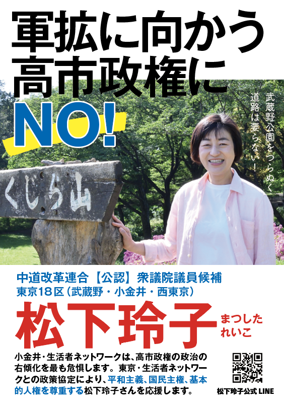 小金井・生活者ネットワークは、東京18区で立候補している「松下玲子」さんを応援します!