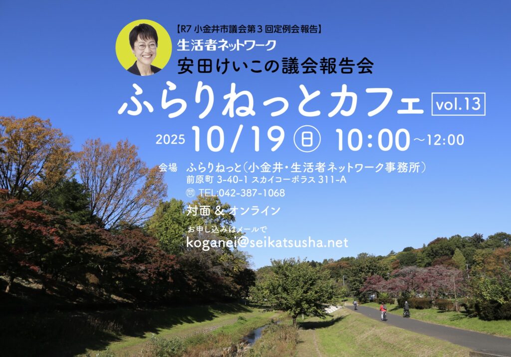 2025年10月14日 / 最終更新日 : 2025年10月14日 koganei 10/19(日):安田けいこの議会報告「ふらりねっとカフェ」 大荒れの小金井市議会が終わり、 保育園はどうなるの?? 都市計画道路は??? と、気になることばかり、、、、 議会報告会をしますので、安田さんの報告を聞きながら、意見交換をしませんか。 Zoomも併用しますので、是非、ご参加ください。 申込は、18日(土)の15時までにメールで、会場かオンラインかをお知らせください。 メール:koganei@seikatsusha.net FacebookXBlueskyHatenaCopy